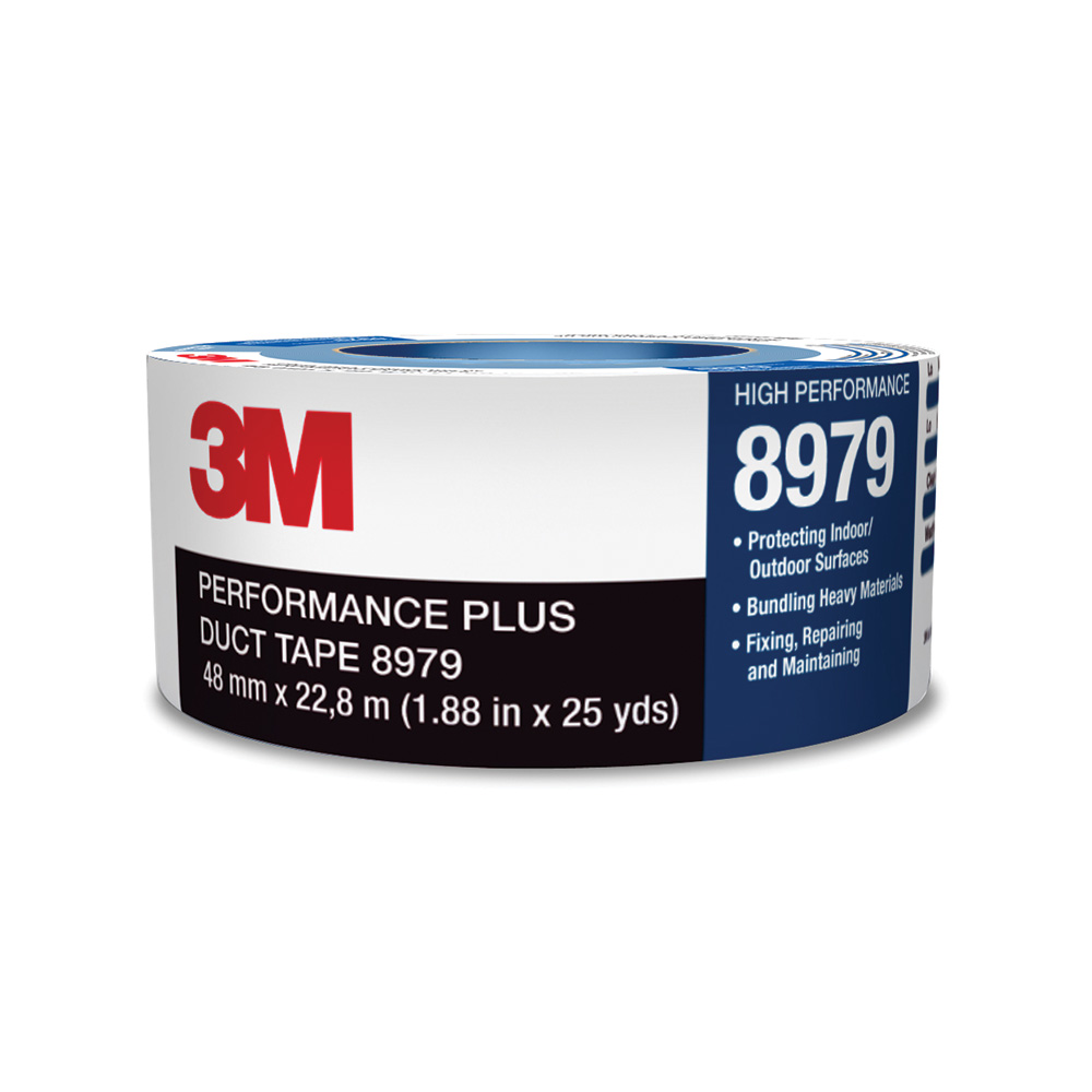 Originally developed for heating, ventilation and air conditioning (HVAC) applications, duct tape is used today in a variety of maintenance, repair and construction settings. 3M™ Performance Plus Duct Tape 8979 removes cleanly for up to six months from most opaque surfaces, even outdoor applications after sun and weather exposure. It sticks immediately and stays on for up to one year without deterioration. The tape was tested for flame spread using test method UL723, ASTM E84 and can be used at temperatures as high as 200°F for up to 30 minutes. This sturdy cloth-reinforced tape can be torn from the roll by hand and sticks instantly, providing a wide range of convenient solutions. We offer 3M™ Performance Plus Duct Tape 8979 in slate blue, black and olive to enhance utility and aesthetics.