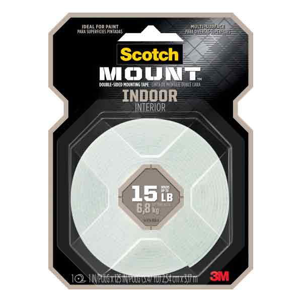 Scotch-Mount Indoor Double-Sided Mounting Tape is ideal for painted surfaces and allows you to quickly and easily beautify and organize your space. Whether you?re creating a gallery wall or affixing the family chore chart, this permanent double-sided foam tape holds up to 15 pounds and delivers a strong bond every time because of its 3M industrial strength adhesive. Your work is up and ready to admire in 30 seconds flat ? no nails or hammer needed. Never let how you?re going to hang it get in the way of your creativity with the powerful adhesion of Scotch-Mount Indoor Double- Sided Mounting Tape.